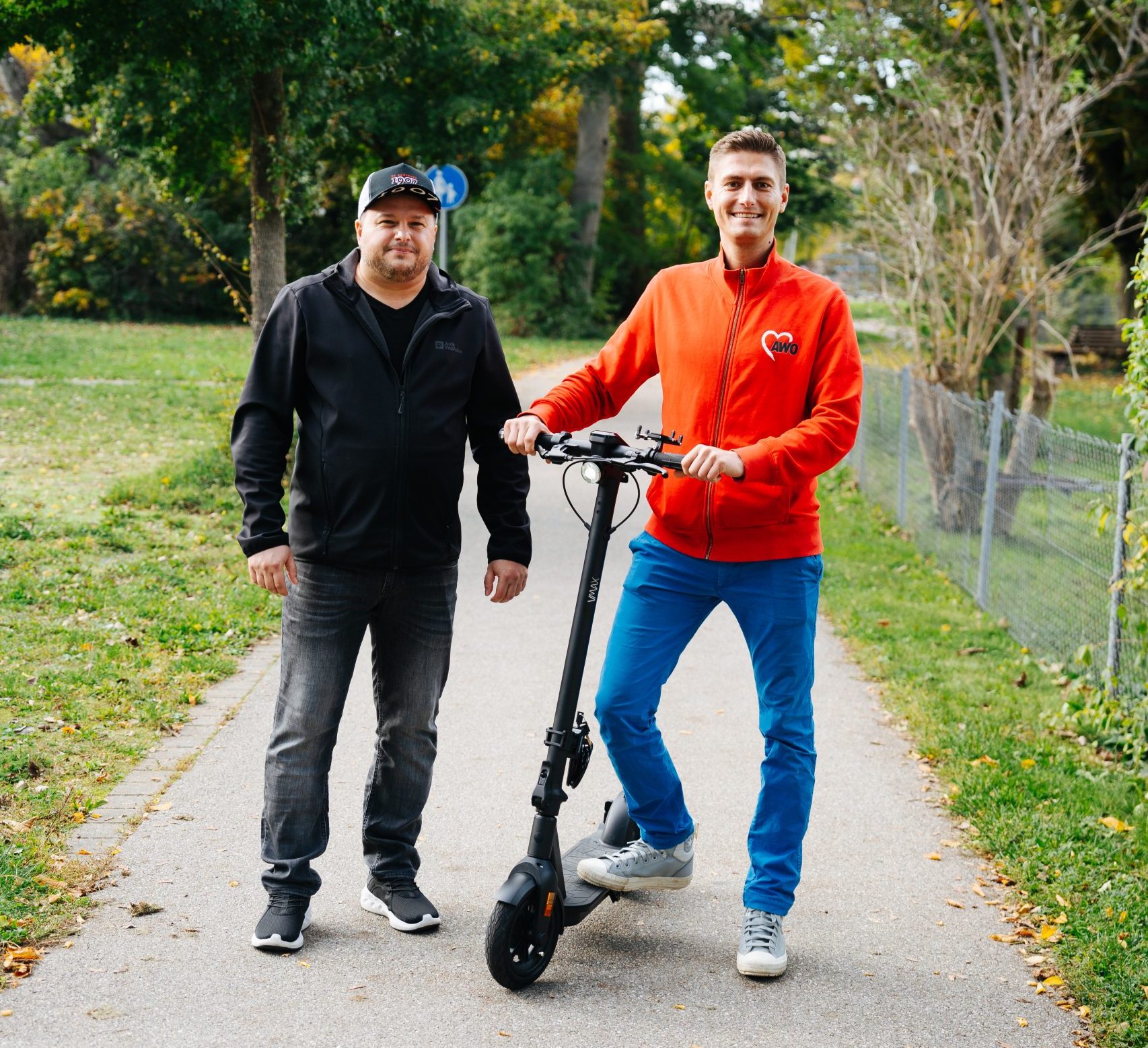 Foto: Der langersehnte E-Roller wurde von Ortwin Binder (links) an Piotr Imiela, Mitarbeiter beim ambulanten Dienst der AWO Augsburg, übergeben.