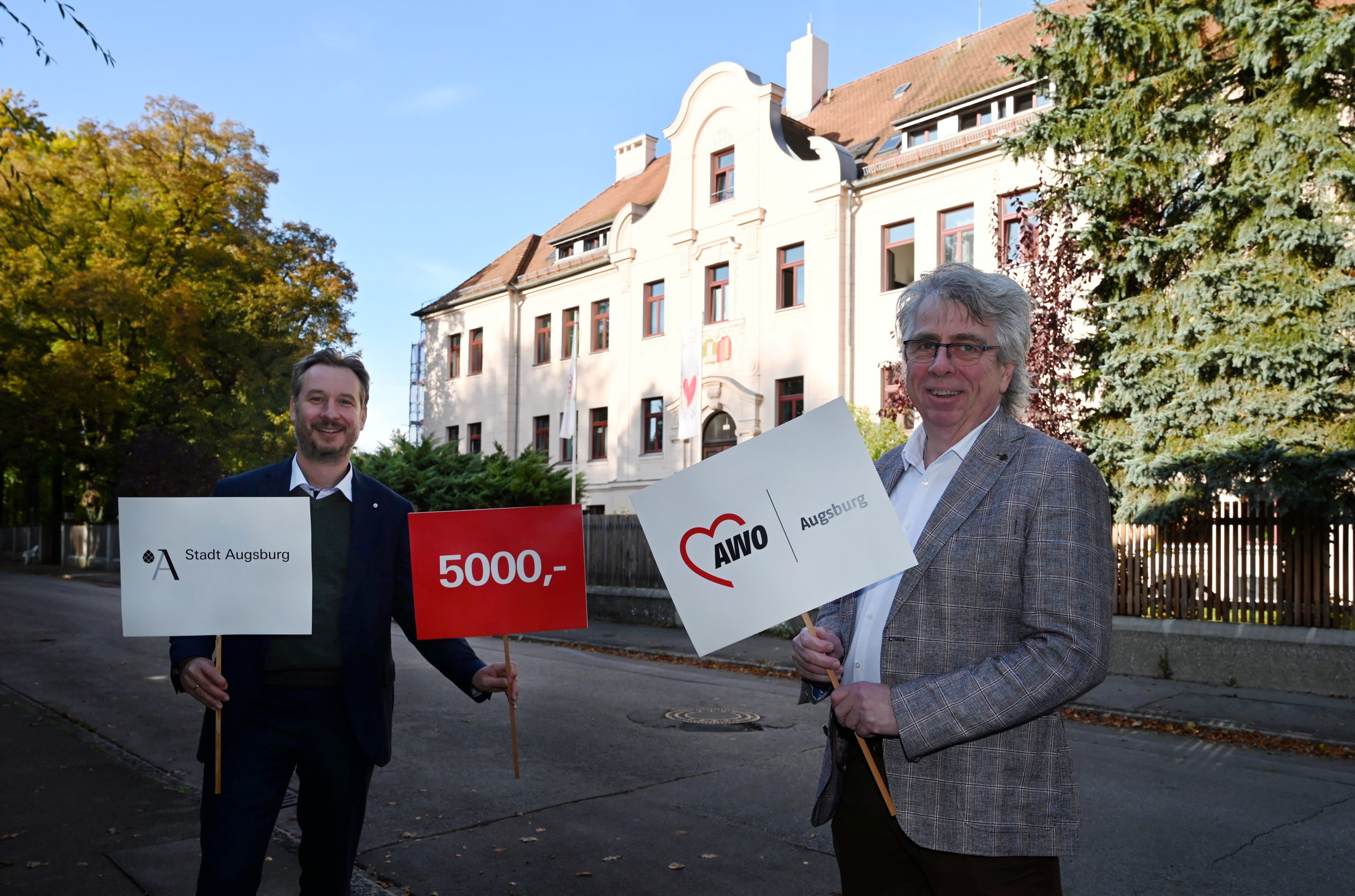 Foto: Baureferent Steffen Kercher von der Stadt Augsburg (links) und Werner Weishaupt, Geschäftsführer der AWO Augsburg, vor dem Clemens-Högg-Haus (Bildrechte: Ruth Plössel/Stadt Augsburg)